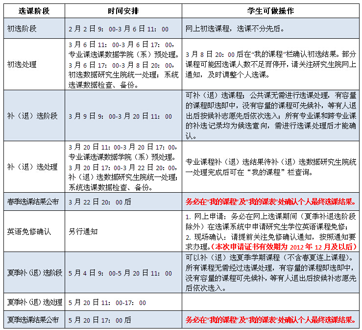本次选课分初选、补(退)选、夏季补(退)选三个阶段,具体时间安排详见下表。