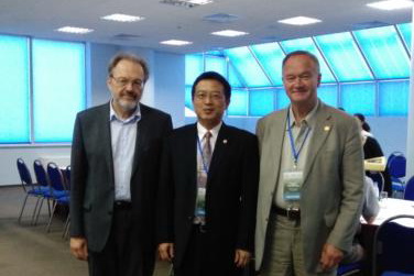 沈杰教授与鲍曼莫斯科国立技术大学副校长谢?科尔舒诺夫教授(右)和乌拉尔联邦大学副校长弗?克鲁扎耶夫教授(左)会谈后合影