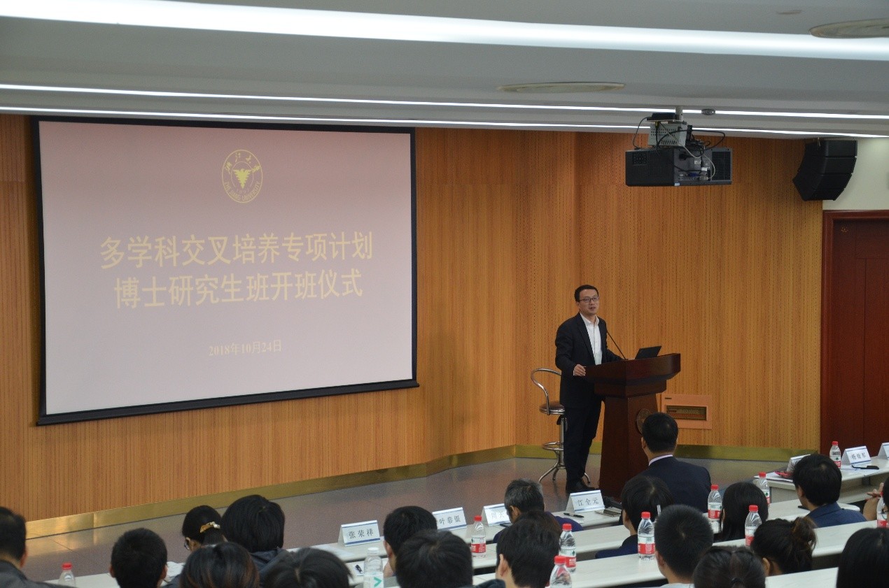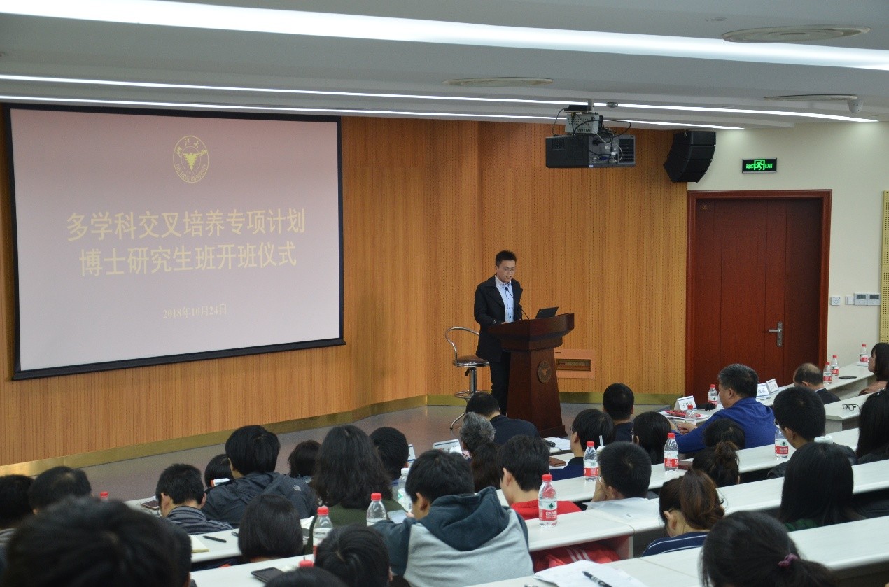 研究生院院长周天华、副院长叶恭银、党委研究生工作部部长(研究生管理处处长)张荣祥、研究生培养处处长江全元、研究生招生处处长周文文等研究生院 “多学科交叉人才培养卓越中心”建设工作组领导及秘书,多学科交叉人才培养卓越中心(平台)主任及秘书,导师代表,2018级多学科交叉培养专项计划博士研究生及2016级和2017级部分交叉培养博士生参加了开班仪式。研究生培养处副处长王晓莹主持会议。