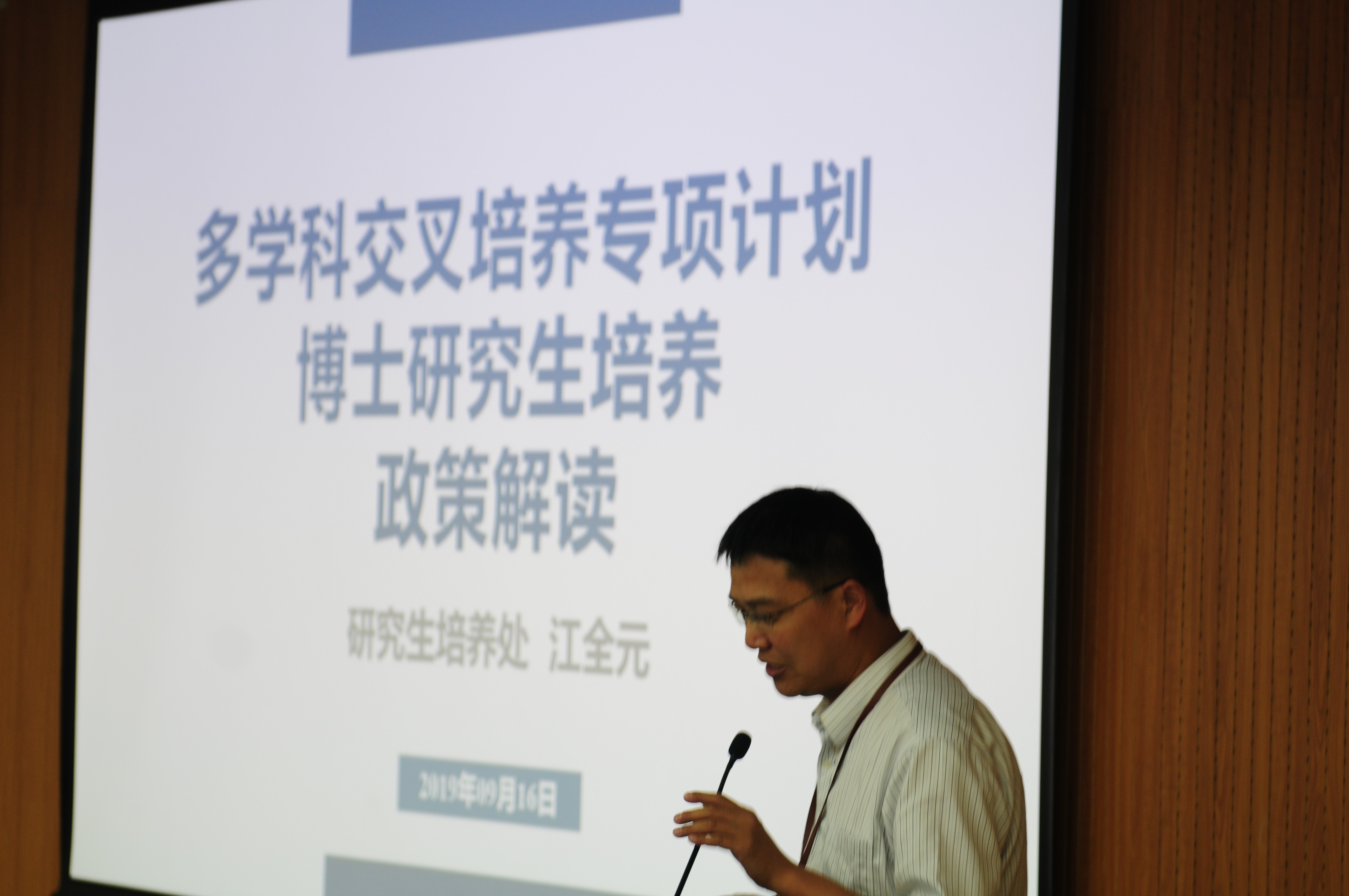 研究生培养处处长江全元详细介绍了国内外交叉人才培养情况及我校多学科交叉博士研究生人才培养实施情况,全面解读了专项计划的招生、培养、管理、学位授予、支撑保障机制及激励政策,鼓励多学科交叉培养的同学们努力产出高水平交叉性科研成果,成为国家经济社会发展需要的复合型高层次创新人才。
