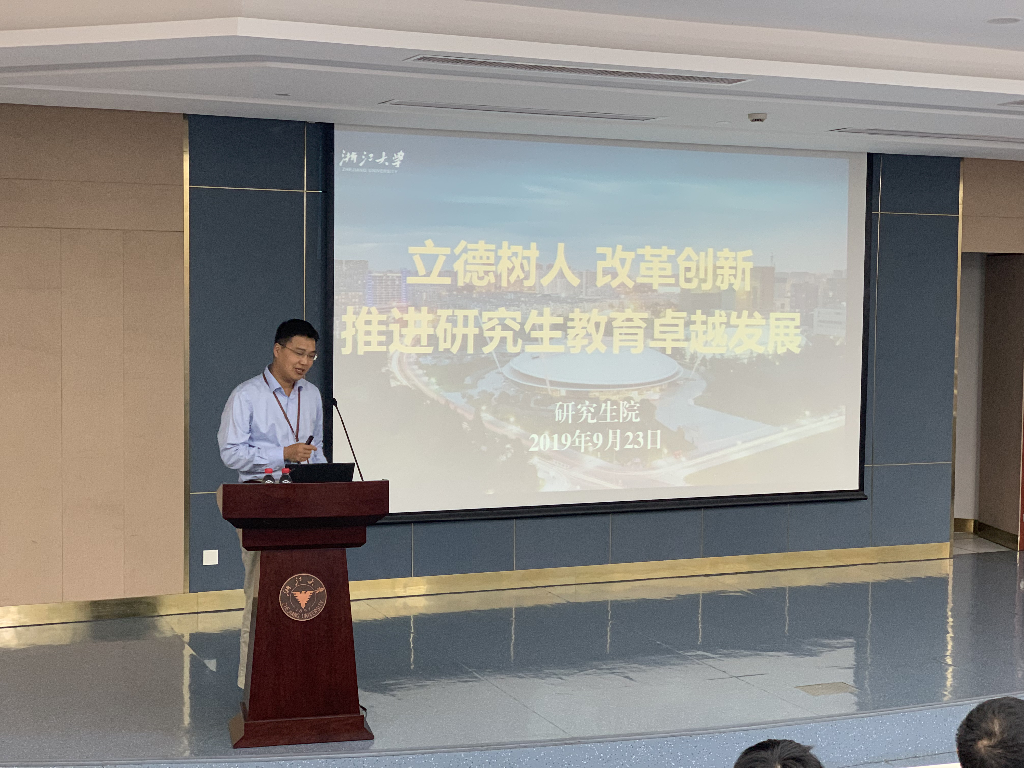 9月23日下午,研究生院受党委教师工作部委托,面向2018年9月以后入校的新教师和专职科研人员组织了一场题为《浙江大学卓越研究生教育的实践与探索》的始业教育专题培训会。会议在紫金港校区蒙民伟楼139报告厅举行,由研究生院研究生培养处处长江全元主持并做培训报告。