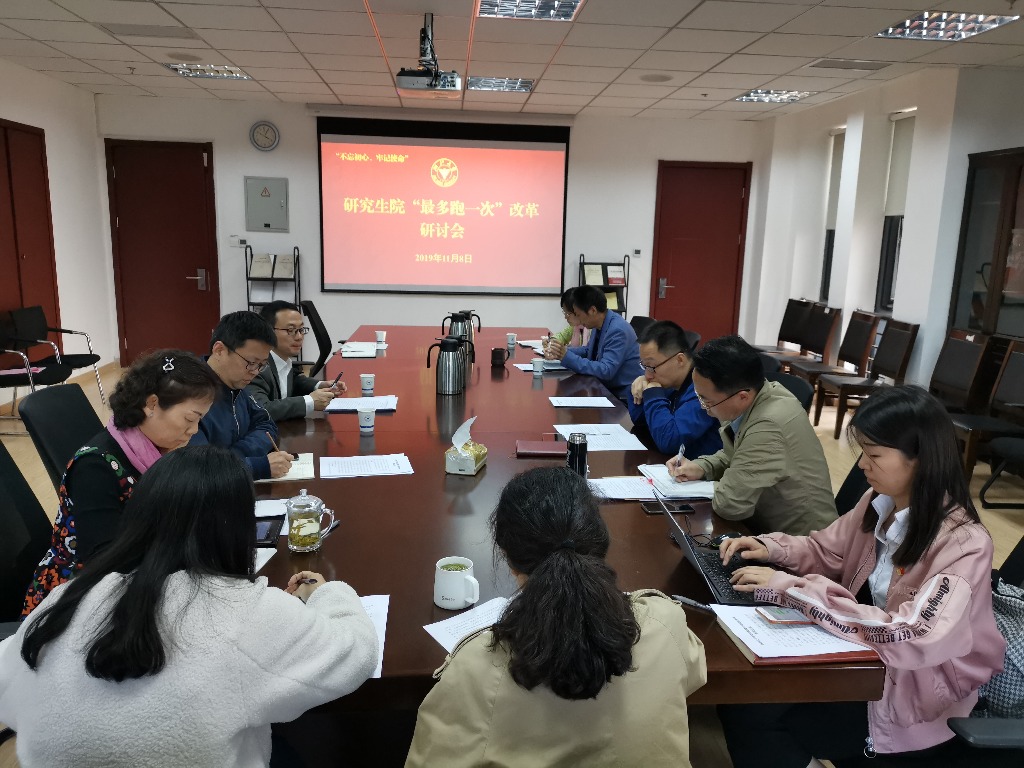 研究生院于2019年11月8日下午在研究生教育综合楼813会议室,召开“最多跑一次”改革研讨会。研究生院院长周天华、研究生培养处副处长陈智峰、办事大厅窗口相关老师及研究生院各处室负责老师参加会议。会议由研究生院办公室主任倪加旎主持。