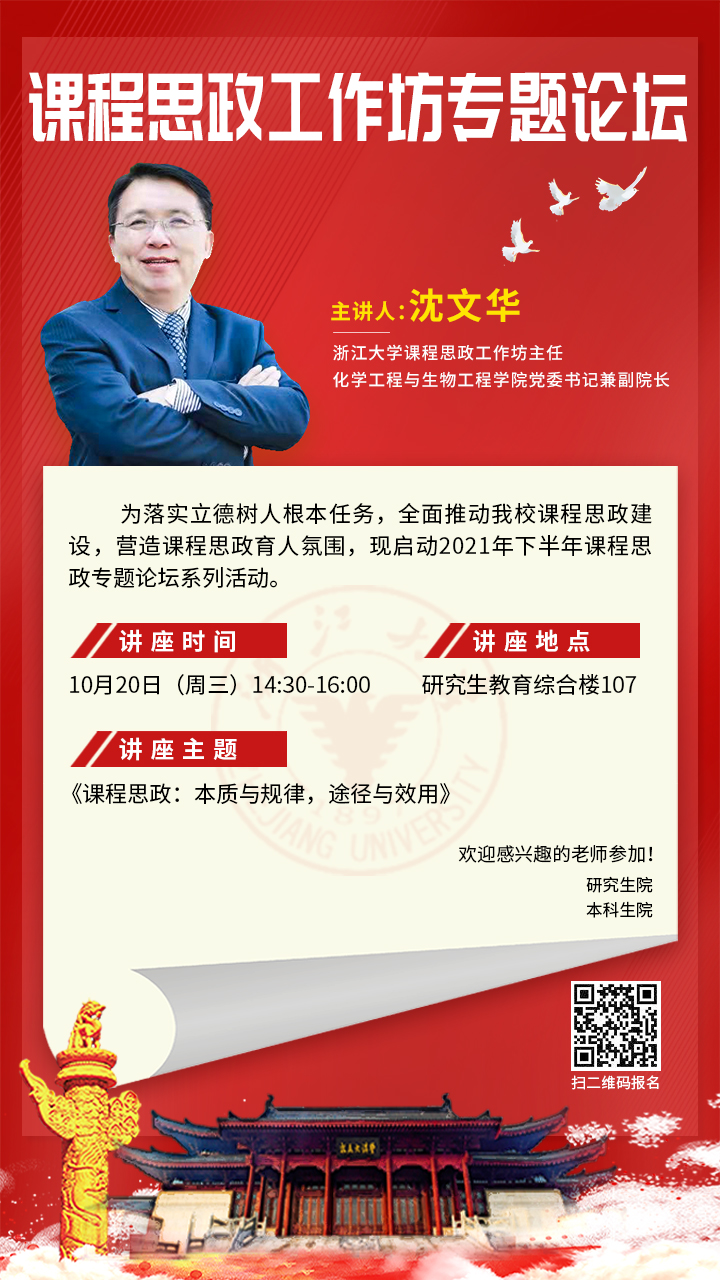 为落实立德树人根本任务,全面推动我校课程思政建设,发挥所有课程育人功能,营造课程思政育人氛围,根据2021年下半年“浙江大学课程思政工作坊”工作方案,现启动2021年下半年课程思政专题论坛系列活动。