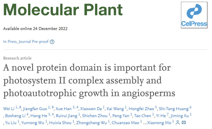 The research article of Prof. Mo Xiaorongs laboratory title “A novel protein domain is important for photosystem II complex assembly and photoautotrophic growth in angiosperms” has been published on Molecular Plant on December 23, 2022.